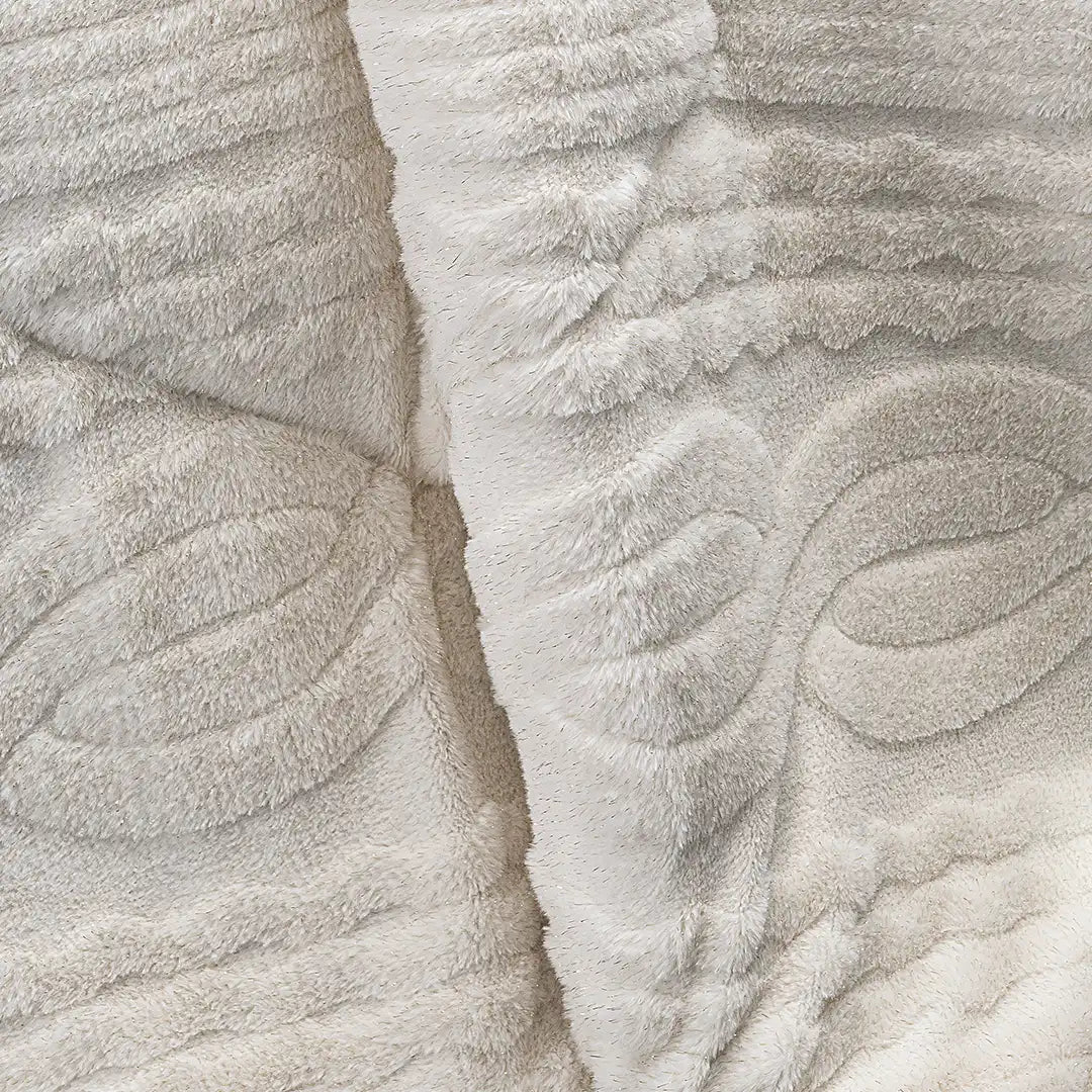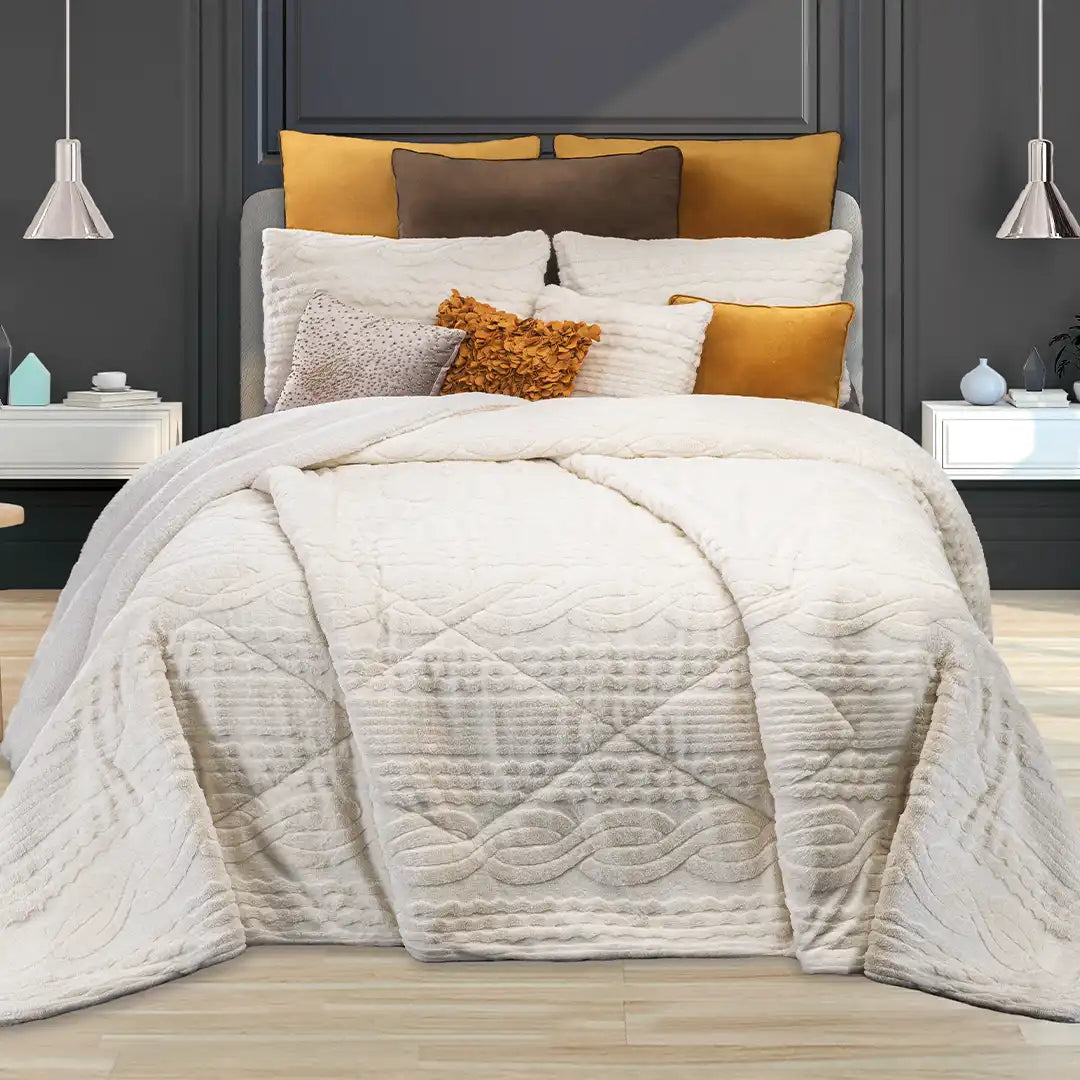 Cobertor Boutique con elegante capitonado entrelazado y sutil brillo gracias a sus hilos metálicos dorados. Ultra suave, térmico y perfecto para una recámara luminosa y sofisticada.
