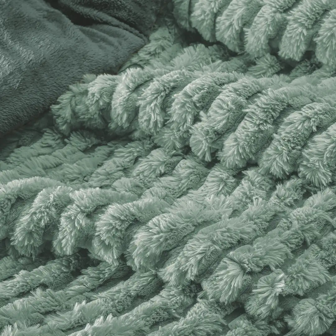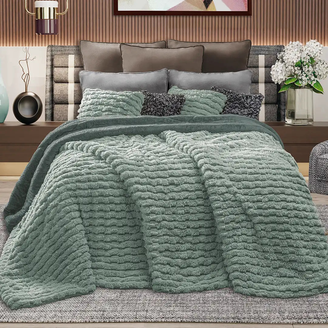 Cobertor Boutique con textura tipo padel de alto relieve, pelo alto ultra suave y calidez excepcional. Diseño elegante en tono agave, ideal para elevar cualquier recámara.