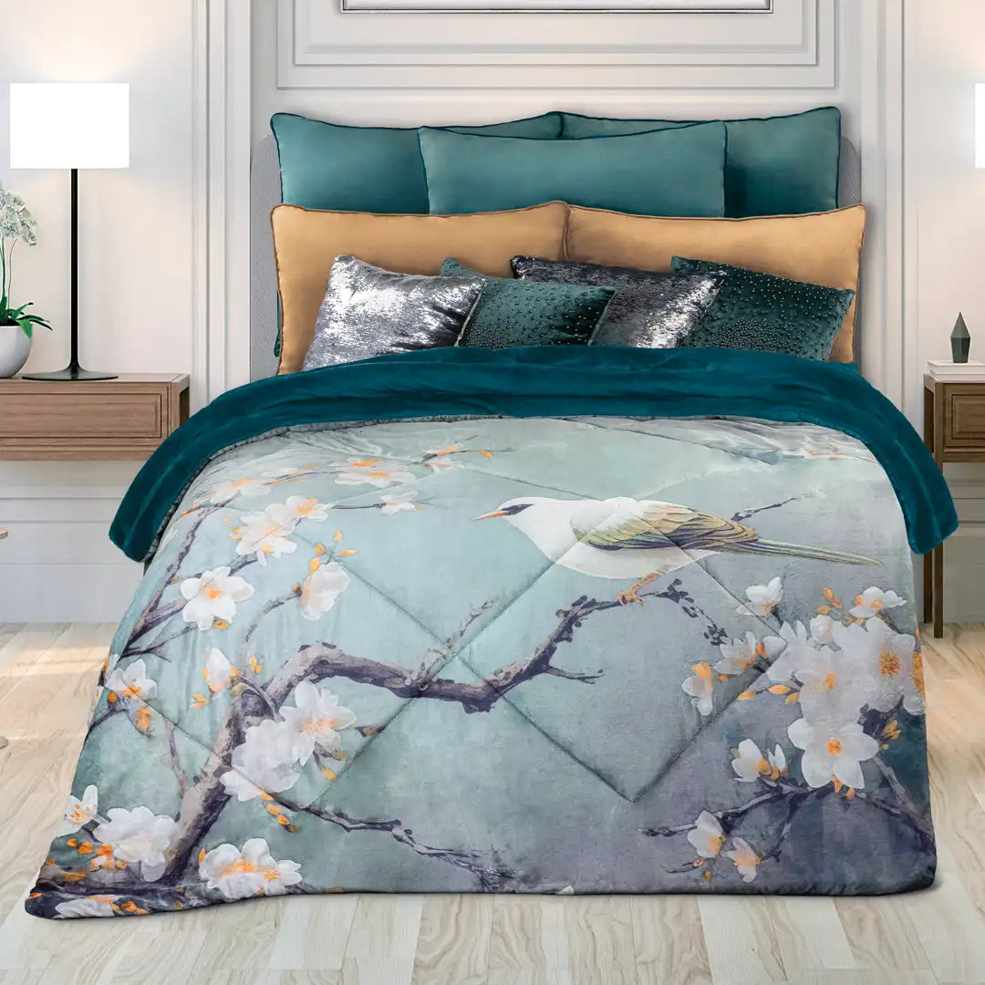 Un diseño con calidad fotográfica que transforma la recámara en un espacio sereno y lleno de vida. Su ilustración de aves entre flores aporta un toque artístico y moderno, mientras que la textura suave y acogedora lo hace perfecto para descansar rico todas las noches.