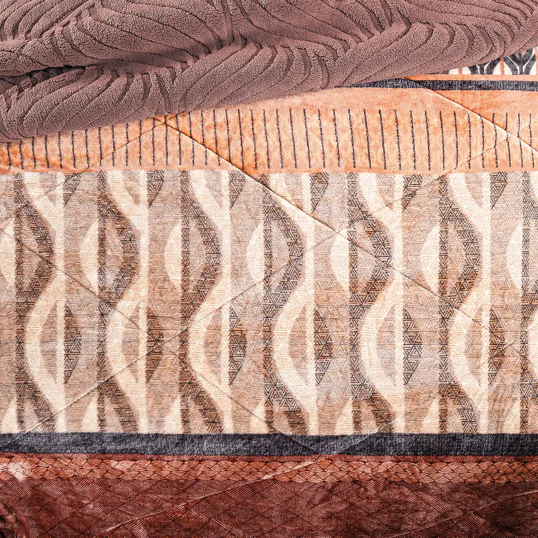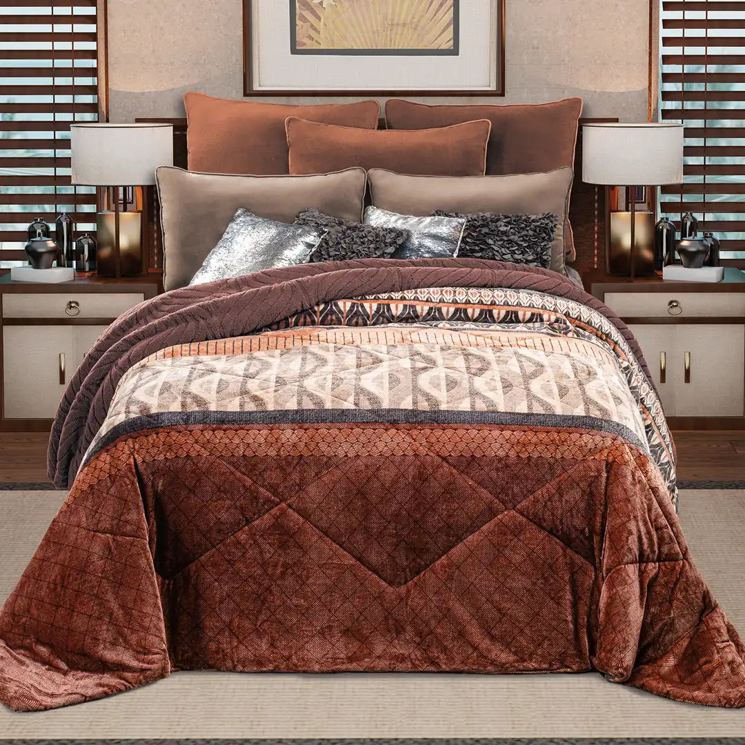 Tonos cálidos en cedro y café que hacen la habitación súper acogedora. Su diseño geométrico destaca sobre una textura tipo piel suave, y gracias a su doble vista puedes cambiar el look del cuarto en segundos. Es muy calientito y confortable, ideal para un ambiente moderno, elegante y hogareño.