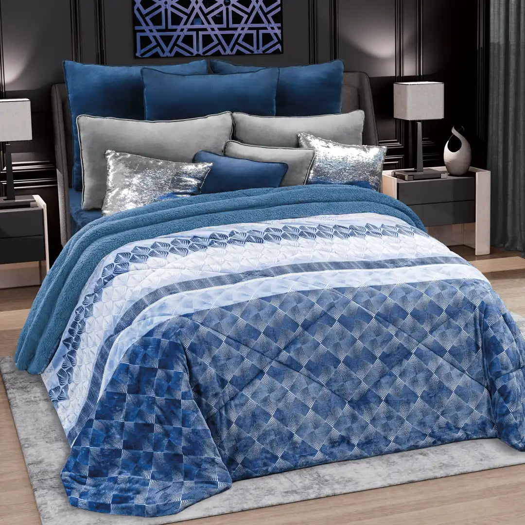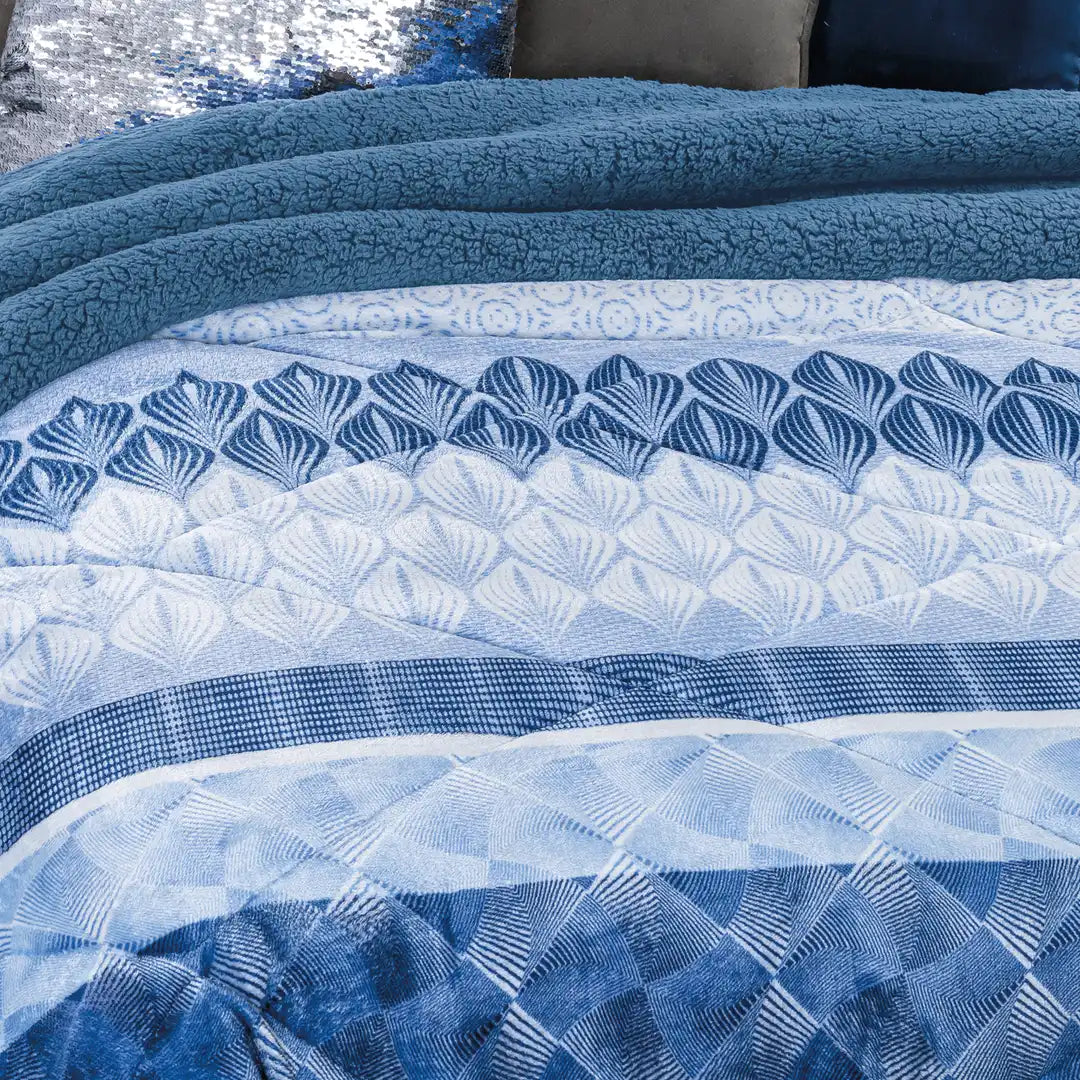 Diseño en tonos azul cielo y marino con un patrón moderno tipo espiral que ilumina la recámara y se ve súper elegante. Su textura suave y acolchada lo hace ultra acogedor, perfecto para descansar delicioso y lograr un ambiente fresco, moderno y muy cómodo.
