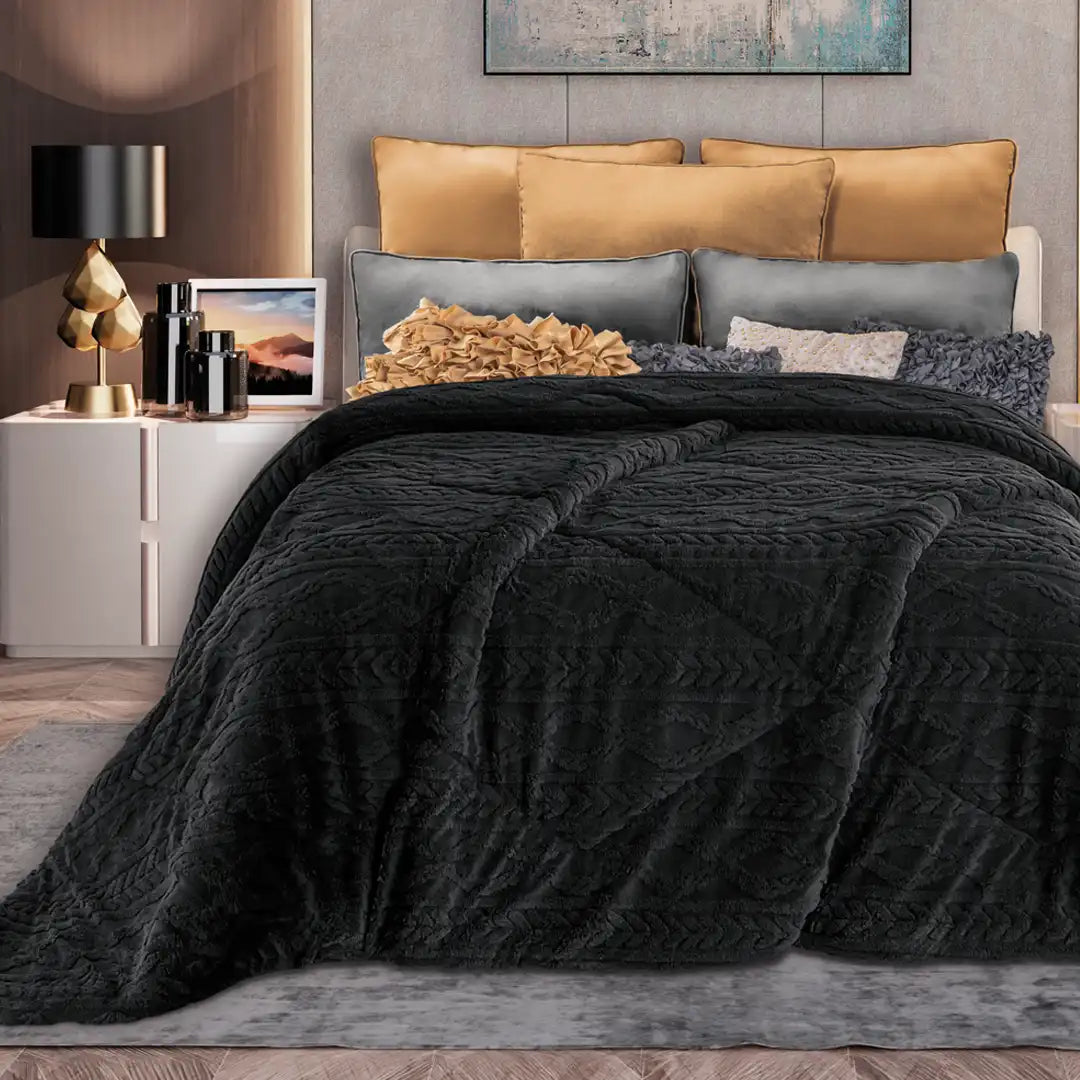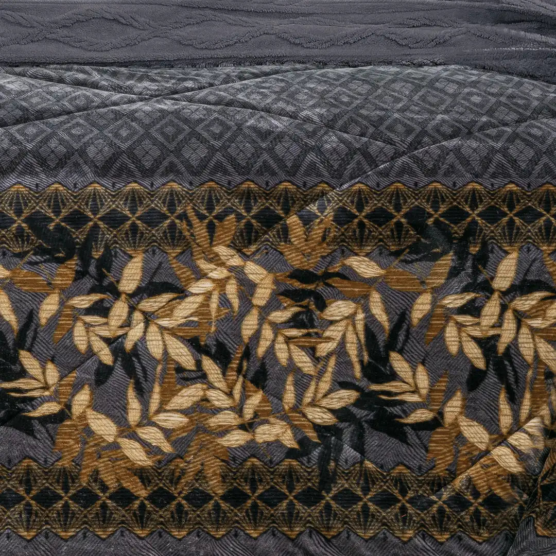 Edre-cobertor Nuvó con diseño en tonos dorados sobre fondo gris profundo, ideal para dar un toque sofisticado y elegante a la recámara. Su reverso Jacquard añade una segunda opción de textura y estilo, permitiendo cambiar por completo la apariencia de la cama. Suave, térmico y con acabado de alta calidad, comodidad con presencia.