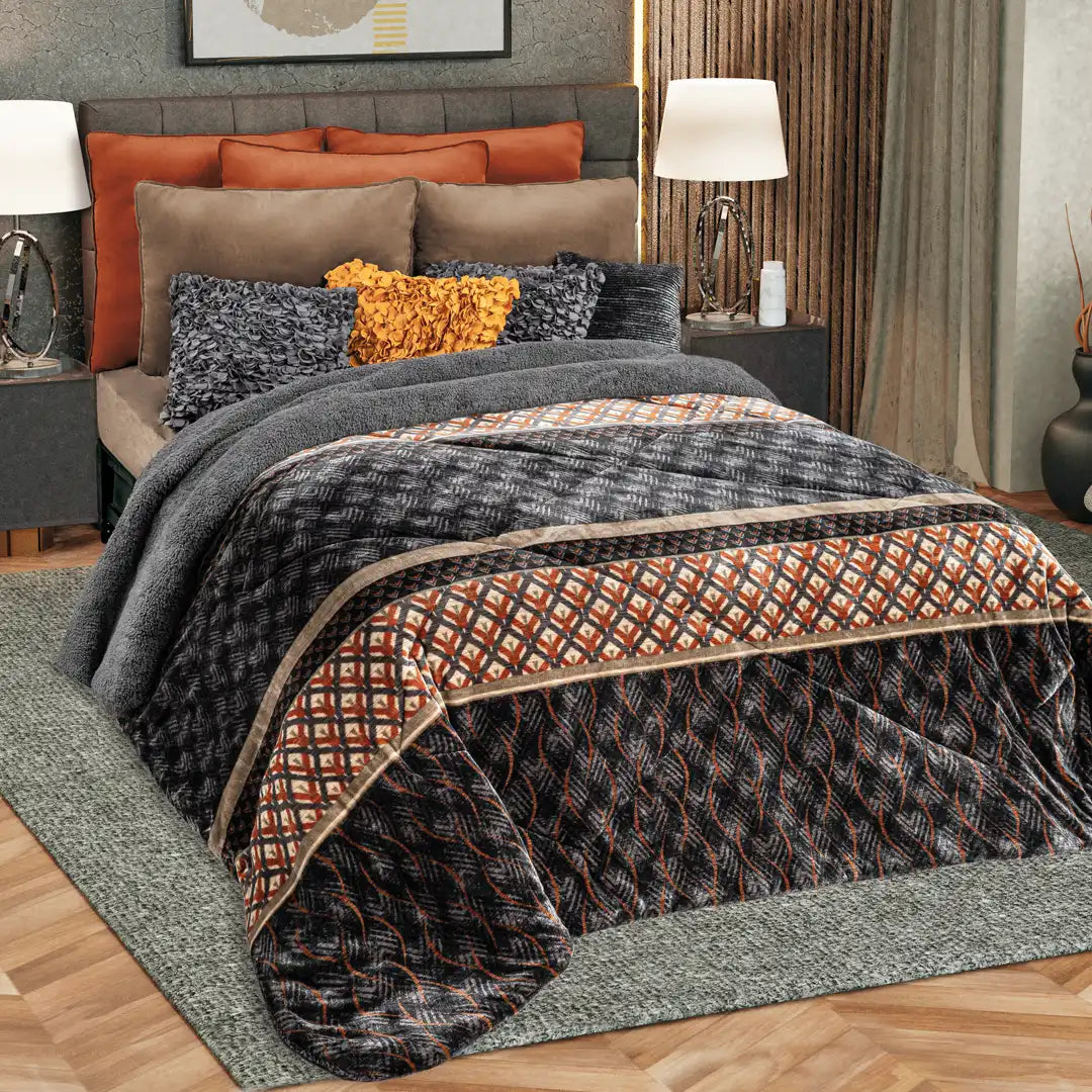 Edre-cobertor Nuvó con diseño geométrico en tonos sombra, óxido y gris profundo. Su combinación de patrones modernos y textura suave lo convierte en una pieza llamativa y acogedora, ideal para recámaras con estilo contemporáneo. Proporciona gran confort, calidez y un acabado visual elegante.