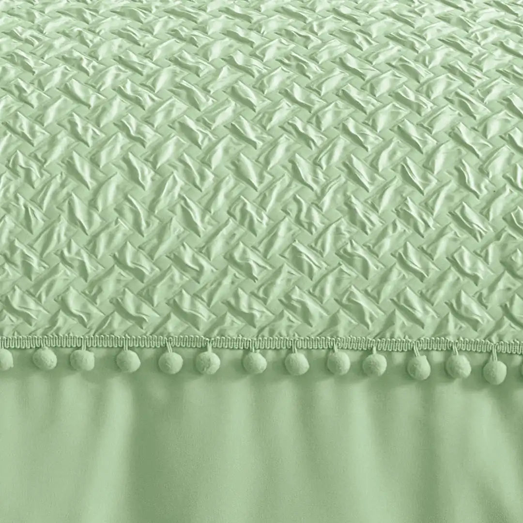 Relieves 3D con telas especiales. Su diseño único crea profundidad y estilo en la recámara, mientras que las aplicaciones como pom-poms y patrones texturizados añaden un toque decorativo encantador.