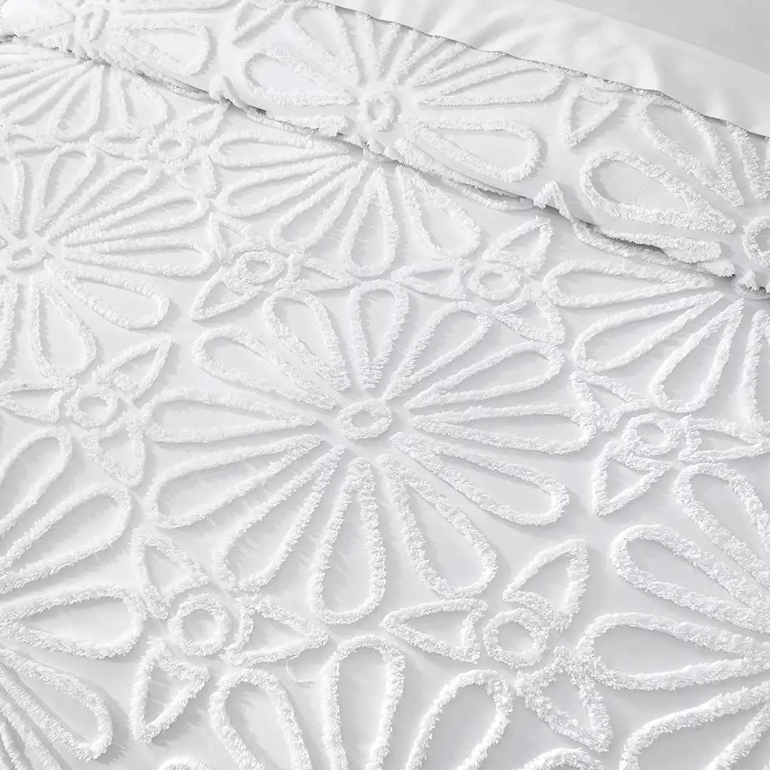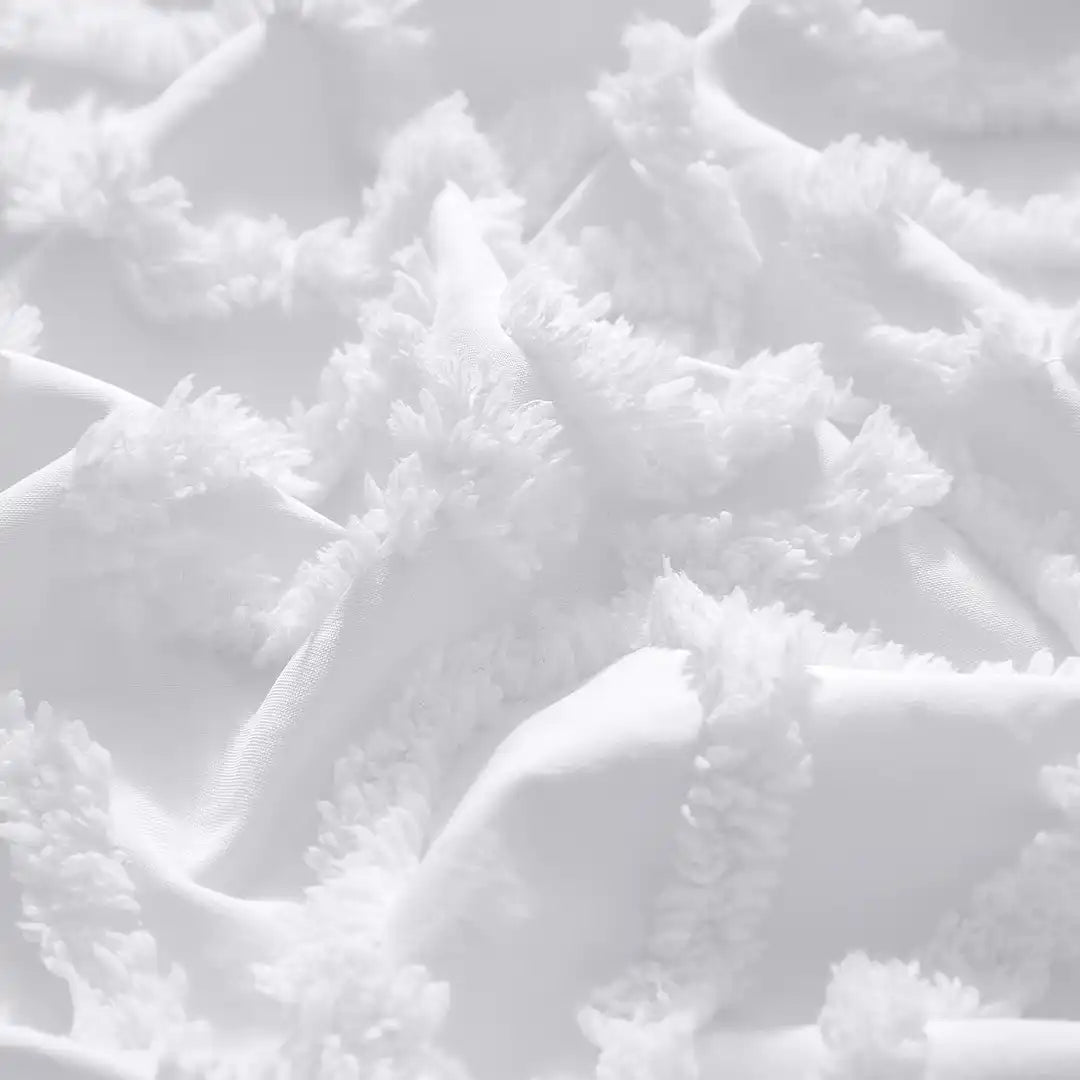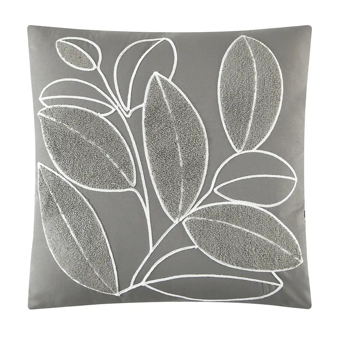 Set de Edredón Florentina en color blanco con textura Jacquard 3D y patrones florales en relieve. Tejido fresco y transpirable, con relleno de volumen medio para una cama siempre impecable. Incluye cojín decorativo Chenille en tono gris con bordado botánico que aporta contraste elegante.