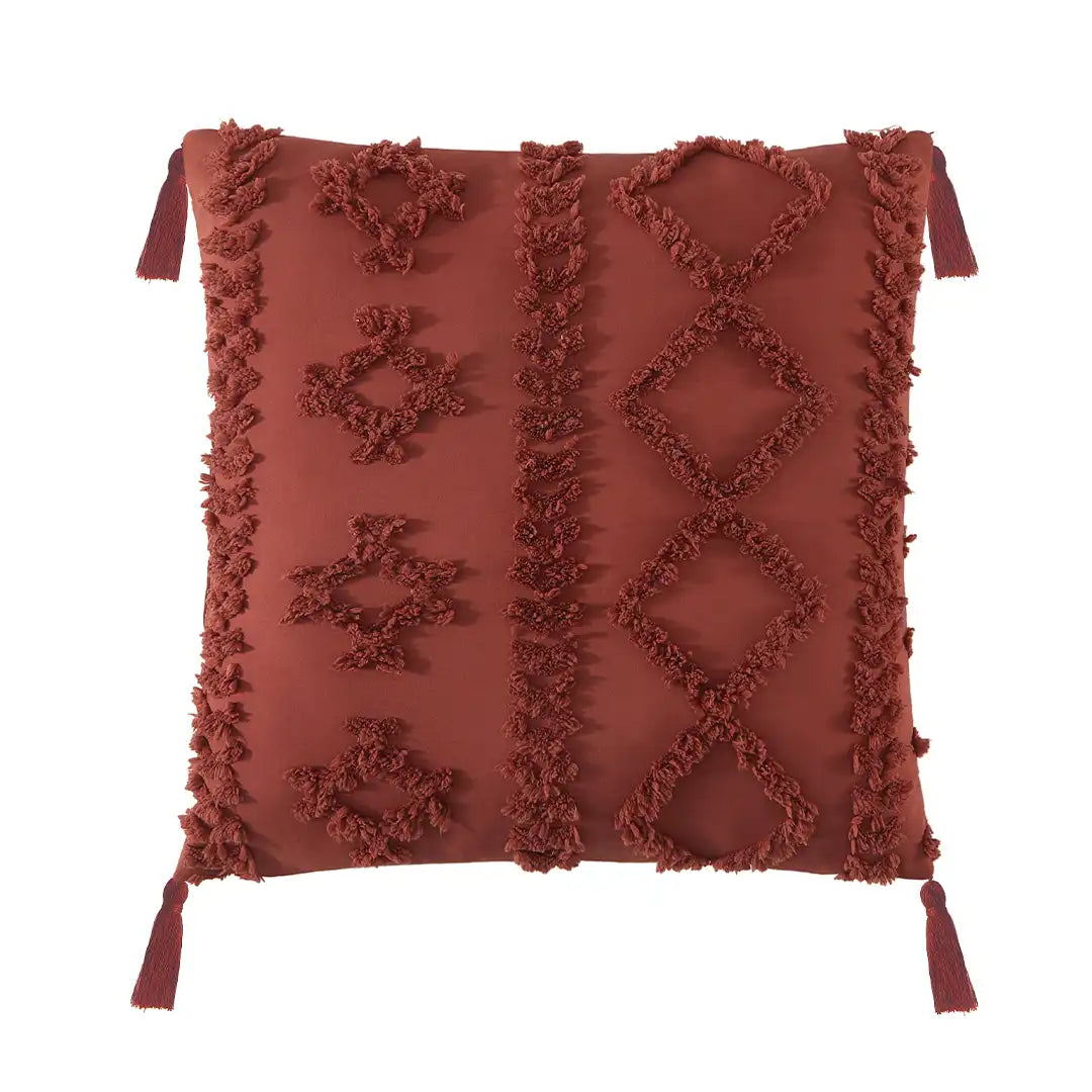 Este modelo destaca por su intenso tono terracota y una rica combinación de texturas que integran bordados tipo Chenille y relieves en Jacquard 3D. Su diseño de patrones geométricos con inspiración étnica aporta un estilo artesanal y acogedor que viste tu espacio al instante.