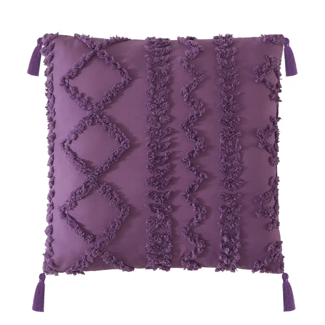 Set de Edredón Fossil Lavanda en tono púrpura con textura Jacquard 3D y bordados Chenille en patrones geométricos de inspiración artesanal. Diseño fresco y transpirable, con relleno de volumen medio para un descanso ligero y una cama siempre impecable. Incluye cojín decorativo con flecos para un toque bohemio sofisticado.