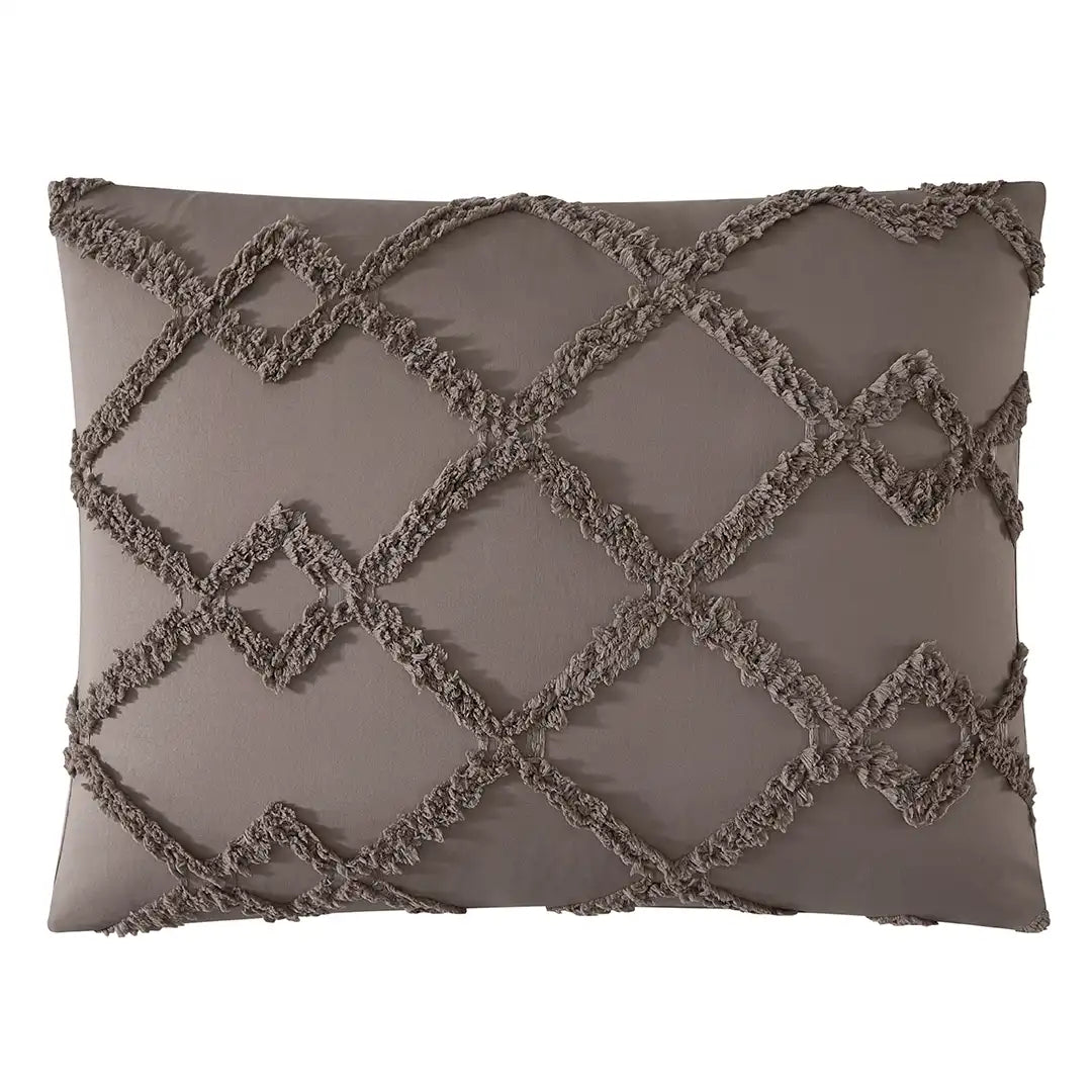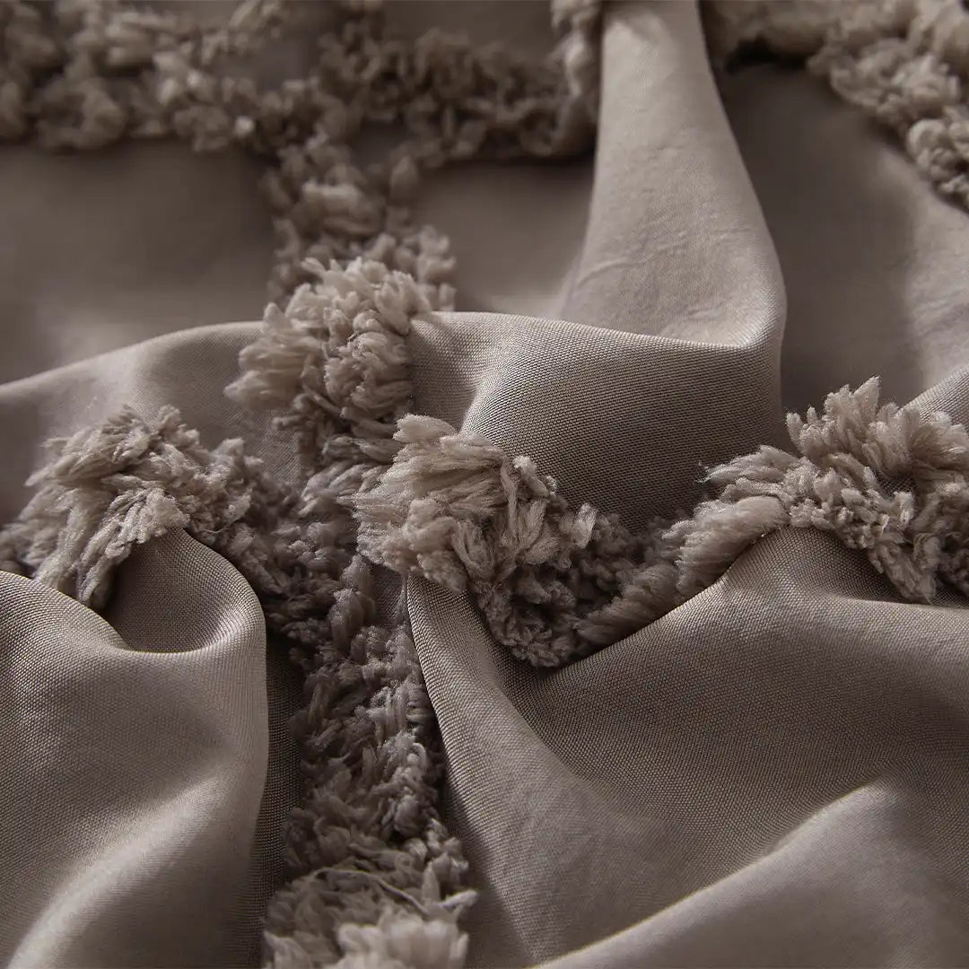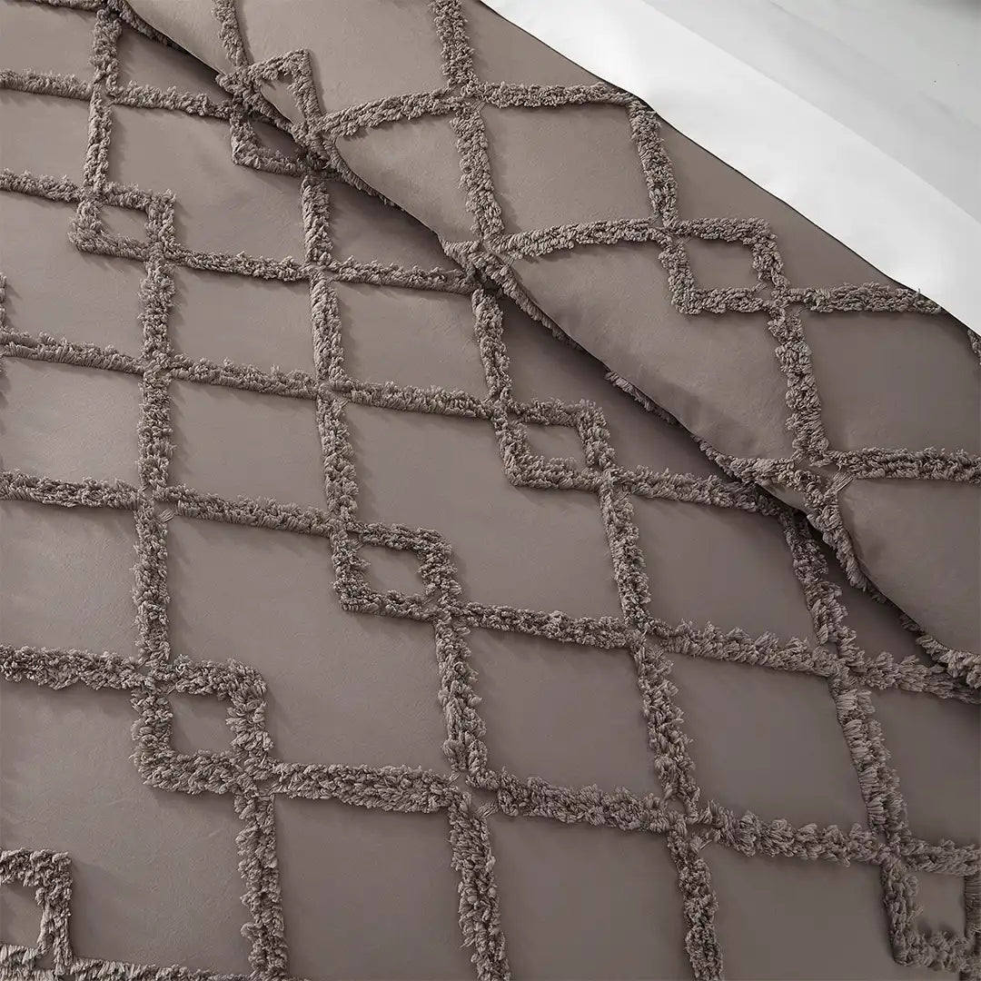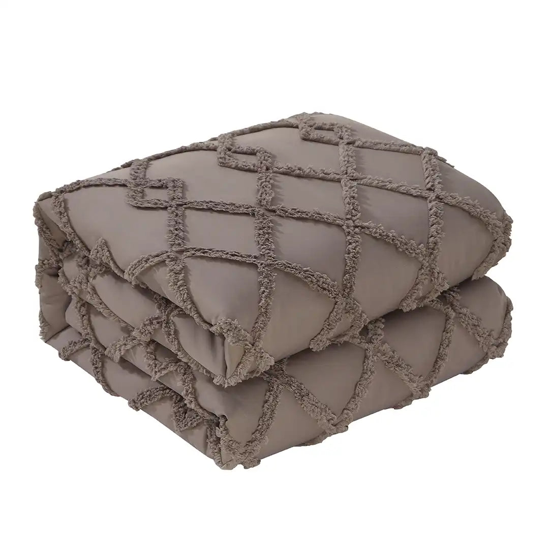 Set de Edredón Opalina en tono taupe/arena con textura Jacquard 3D en patrón de rombos. Tejido fresco y transpirable, con relleno de volumen medio para una cama moderna e impecable. Incluye cojín decorativo Velvet plisado que aporta contraste elegante.