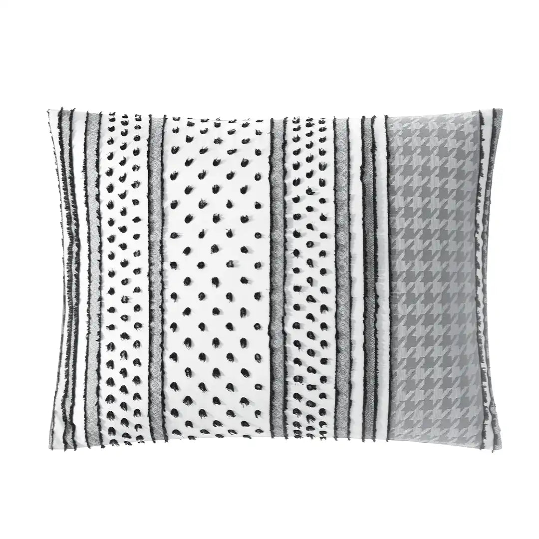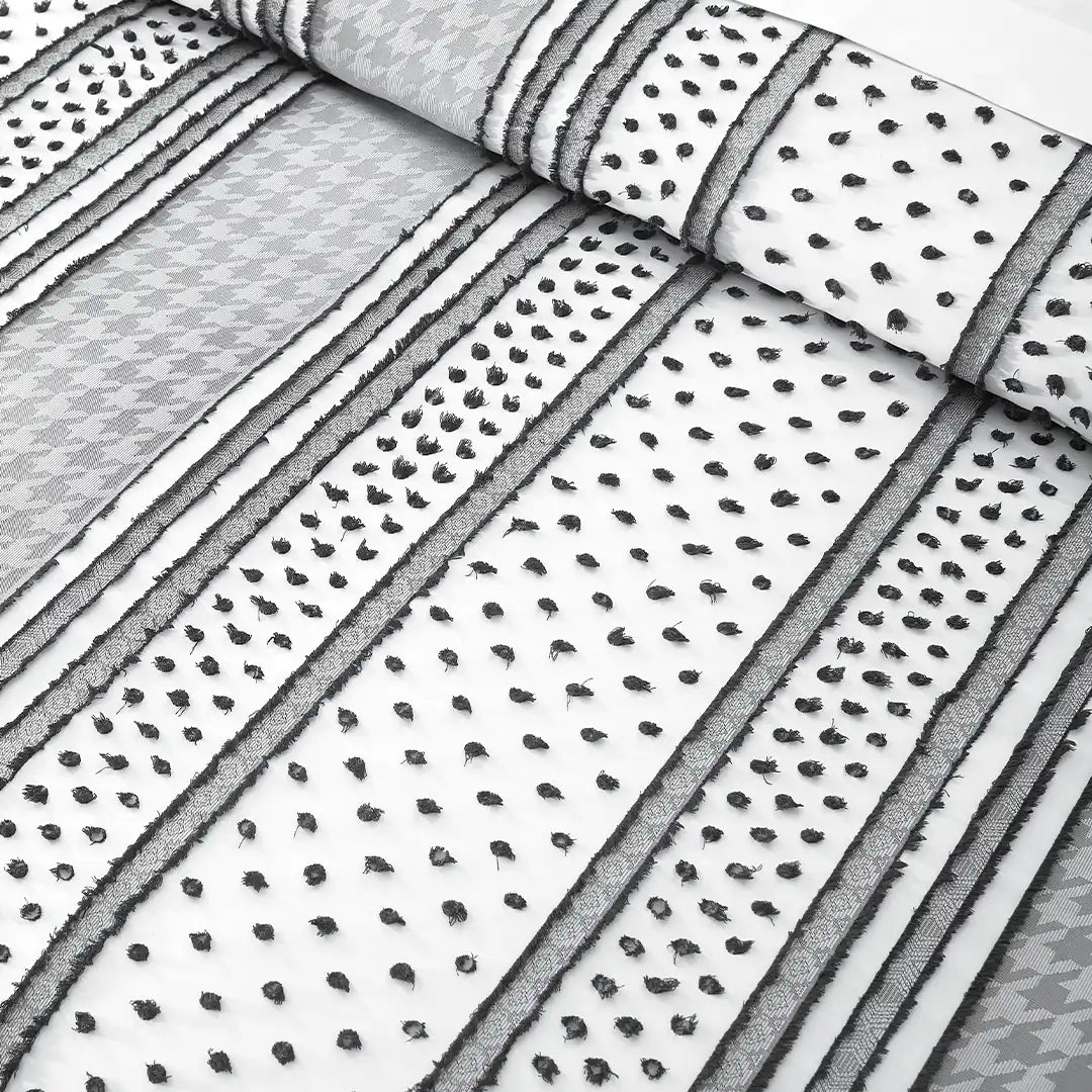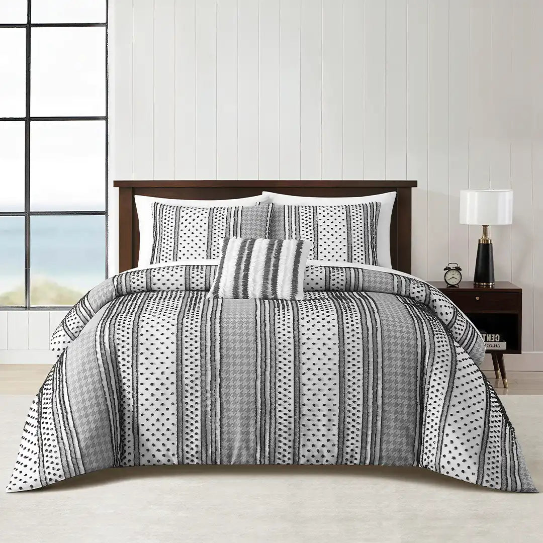 Set de Edredón Zaccary en tonos grises con textura Jacquard 3D y diseño geométrico multitextura. Tejido fresco y transpirable, con relleno de volumen medio para una cama moderna e impecable. Incluye cojín decorativo con flecos que aporta un toque artesanal contemporáneo.