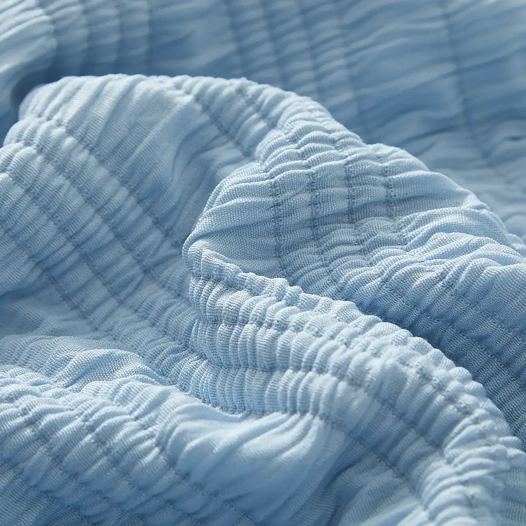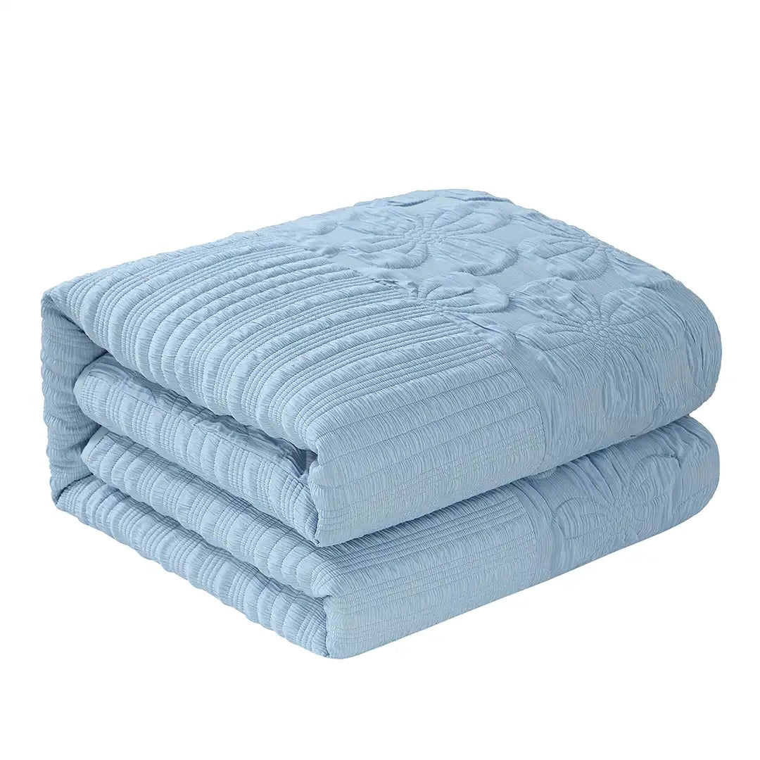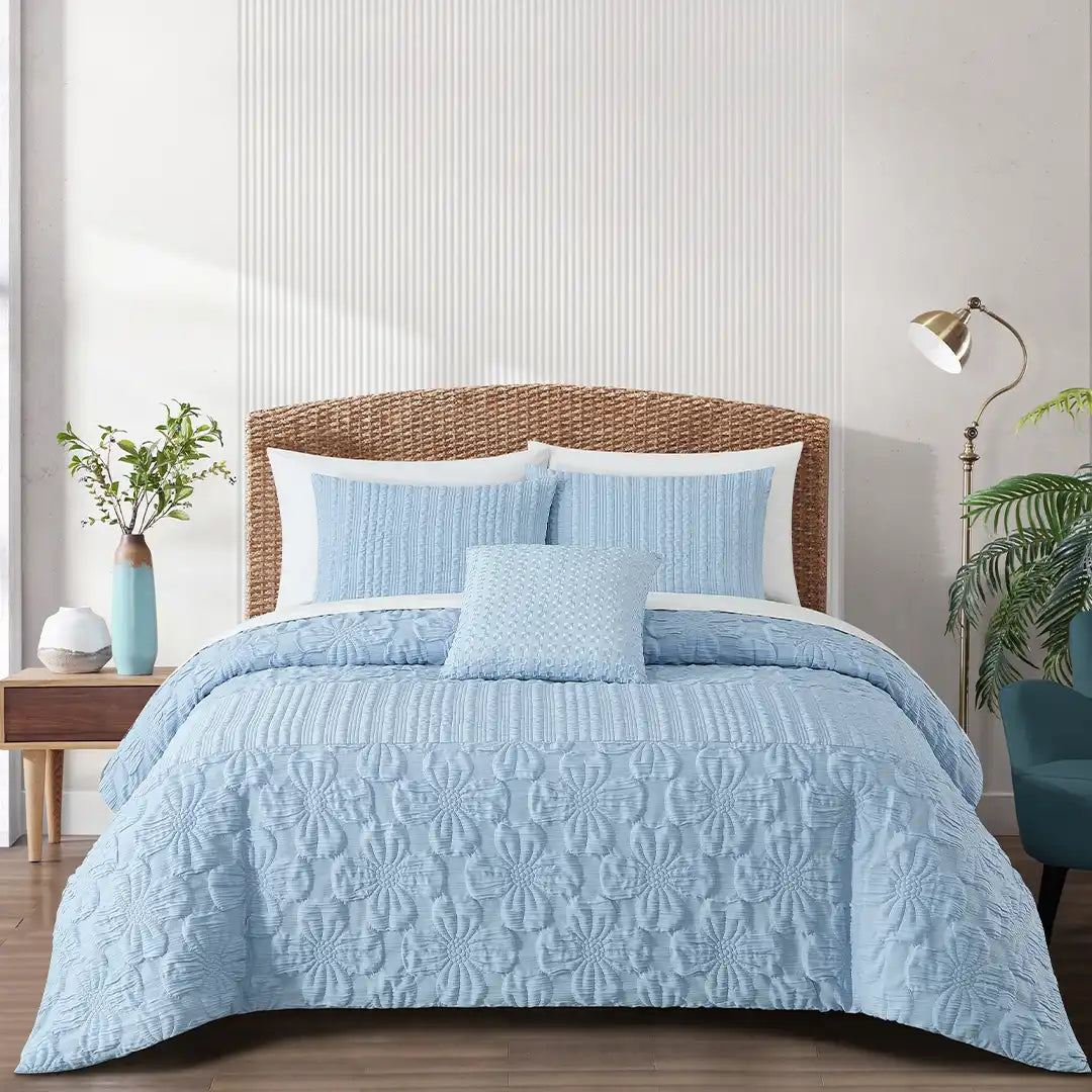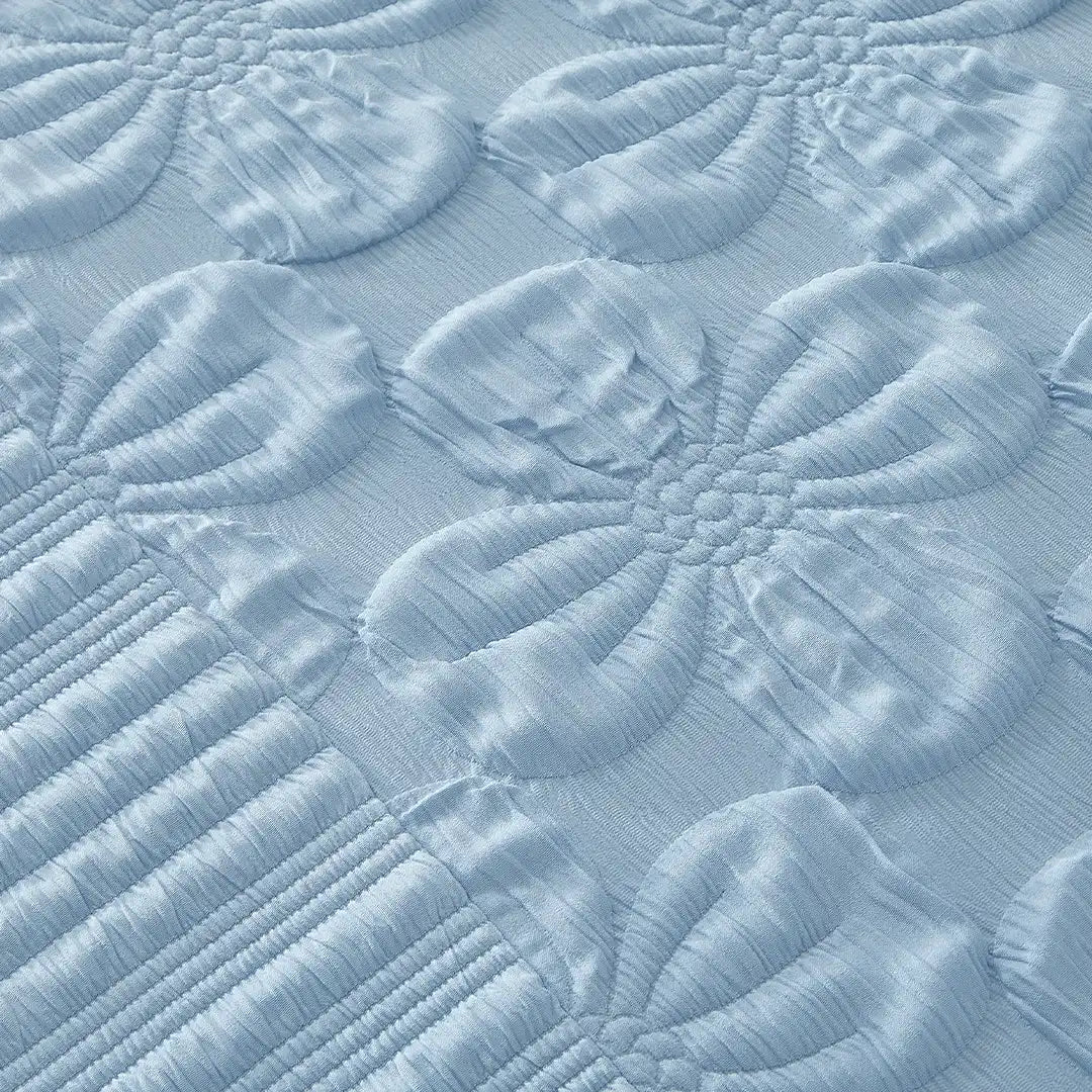 Set de Edredón Alejandría Delicaz en tono azul celeste con textura Jacquard 3D, acabados plisados y medallones florales en relieve. Tejido fresco y transpirable, con relleno de volumen medio para una cama elegante e impecable. Incluye cojín decorativo con bordado satinado que aporta brillo sofisticado.