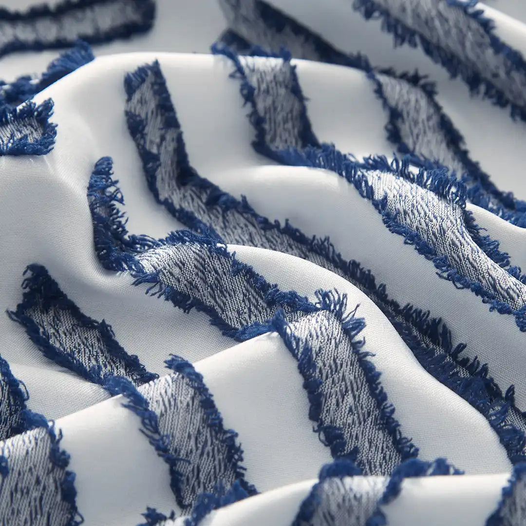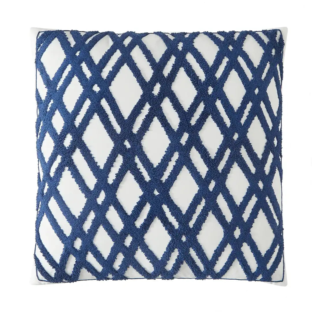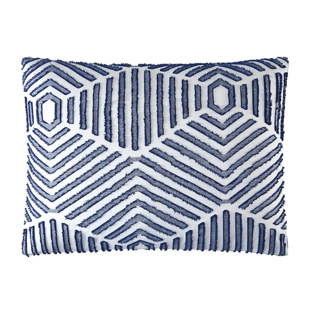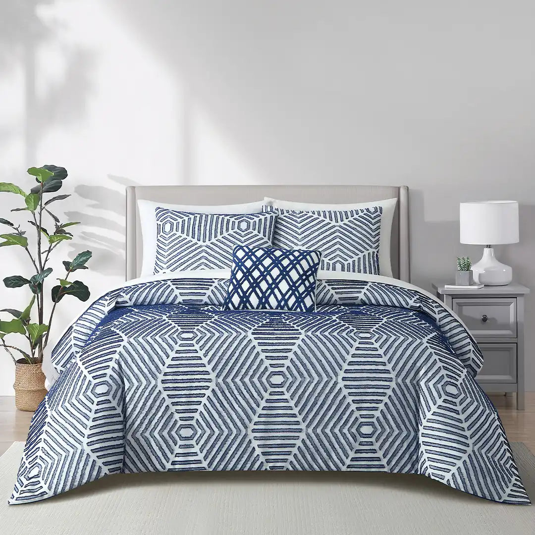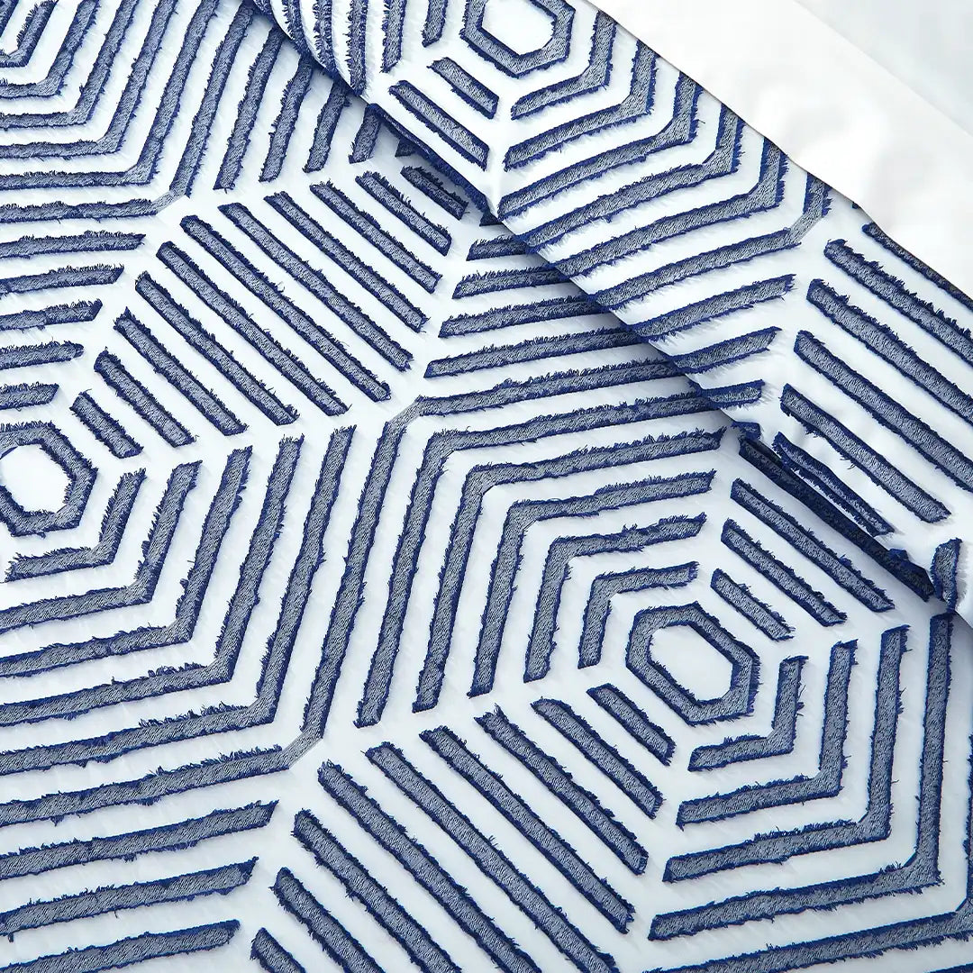 Set de Edredón Colina con patrón geométrico de hexágonos en azul y blanco, textura Jacquard 3D y relieve visual sofisticado. Tejido fresco y transpirable, con relleno de volumen medio para una cama siempre impecable. Incluye cojín decorativo Chenille que complementa el diseño moderno.