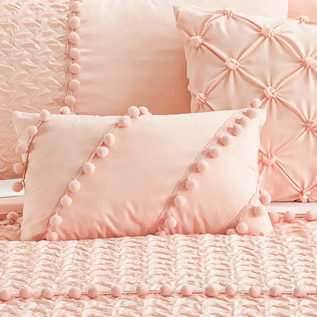 Set de Edredón Pietra en color durazno con capitonado artesanal y pompones decorativos que aportan textura y un estilo femenino elegante. Confeccionado en tejido jacquard fresco y transpirable, con relleno de volumen medio para un confort ligero. Incluye dos cojines decorativos para una cama perfectamente coordinada.